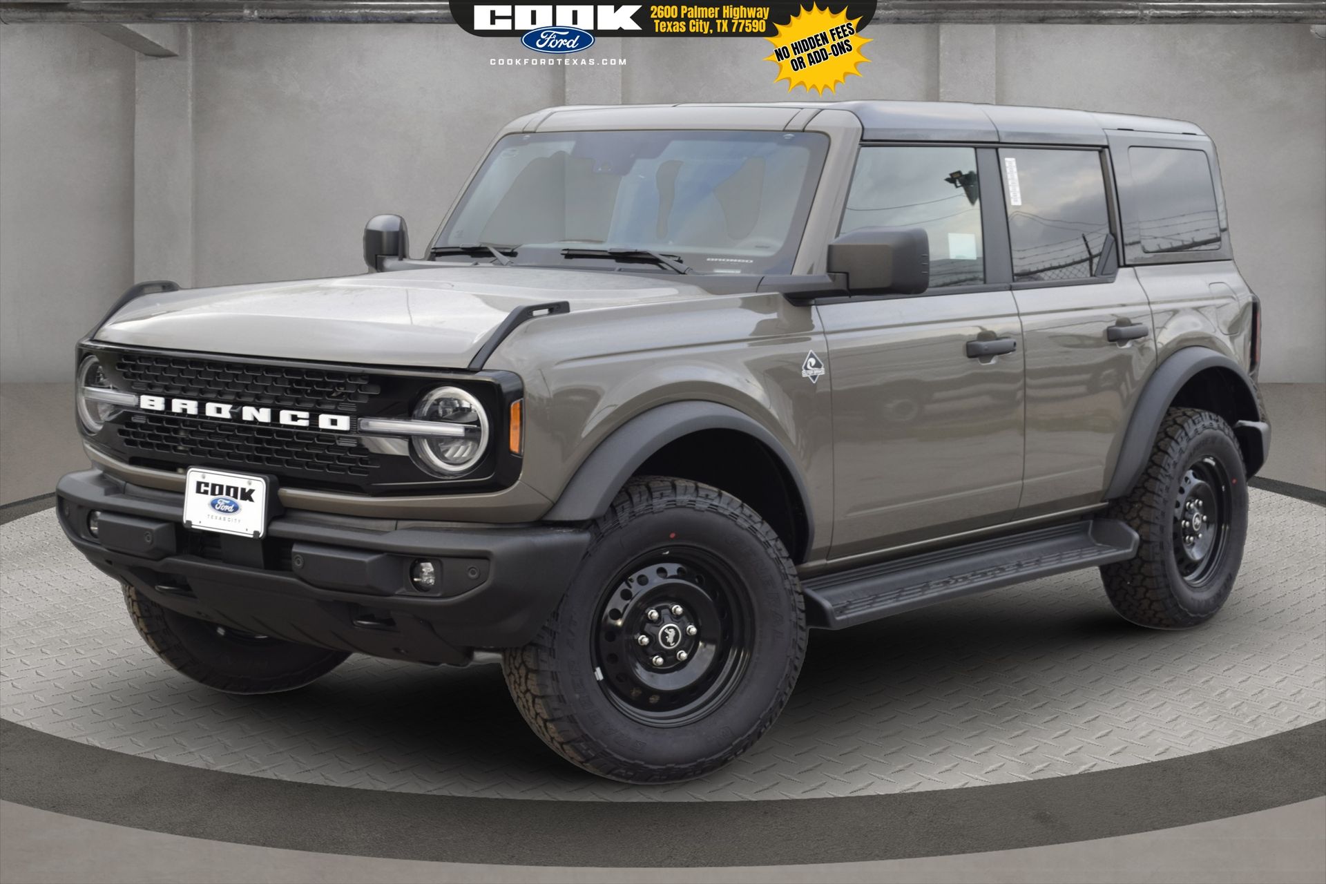 This 2026 Ford Bronco Outer Banks in Marsh Gray comes with the following features: 2.7L EcoBoost® V6 10-Speed Automatic 4WD Black Appearance Package (Black Molded-in-Color Door Handles, Black Molded-in-Color Fender Flares, Black Molded-in-Color Sideview Mirror Caps, and Black-Painted Molded-in-Color Grille), Equipment Group 314A Lux Package (18″ Bright Machined Aluminum Wheels, 3.73 Axle Ratio, 360-Degree Camera, Adaptive Cruise Control, Evasive Steering Assist, Front Parking Sensors, Heated Leather-Trimmed/Vinyl Bucket Seats, Information on Demand Panel, and Sideview Mirrors), Ford Connectivity Package (1-Year Included), 4-Wheel Disc Brakes, 7 Speakers, ABS brakes, Air Conditioning, Alloy wheels, AM/FM radio: SiriusXM with 360L, AM/FM Stereo, Auto High-beam Headlights, Auto-dimming Rear-View mirror, Automatic temperature control, Brake assist, Compass, Connected Navigation, Delay-off headlights, Driver door bin, Driver vanity mirror, Dual front impact airbags, Dual front side impact airbags, Electronic Stability Control, Emergency communication system: 911 Assist, Exterior Parking Camera Rear, Front anti-roll bar, Front Bucket Seats, Front Center Armrest, Front dual zone A/C, Front fog lights, Front License Plate Bracket, Front reading lights, Front wheel independent suspension, Fully automatic headlights, Hard Top Sound Deadening Headliner, Heated door mirrors, Heated Front Seats, Heated steering wheel, Illuminated entry, Integrated roll-over protection, Leather Shift Knob, Low tire pressure warning, Navigation system: Connected Navigation, Occupant sensing airbag, Outside temperature display, Overhead airbag, Overhead console, Panic alarm, Passenger door bin, Passenger vanity mirror, Power door mirrors, Power driver seat, Power passenger seat, Power steering, Power windows, Radio data system, Rear seat center armrest, Rear-Window Defroster and Washer, Remote keyless entry, Security system, Shadow Black-Painted Hard Top, SiriusXM with 360L, SiriusXM with 360L (3-Year Plan), Speed control, Split folding rear seat, Steering wheel mounted audio controls, SYNC® 4, Tachometer, Telescoping steering wheel, Tilt steering wheel, Traction control, Trip computer, Variably intermittent wipers, and Voltmeter. Rebates subject to geographical qualification. Price includes: *Manufacturer’s Rebates shown above are subject to residency restrictions. Any customer not meeting the residency restriction will receive a dealer discount in the same amount of the manufacturer rebate.$750 – Retail Customer Cash. Exp. 04/30/2026