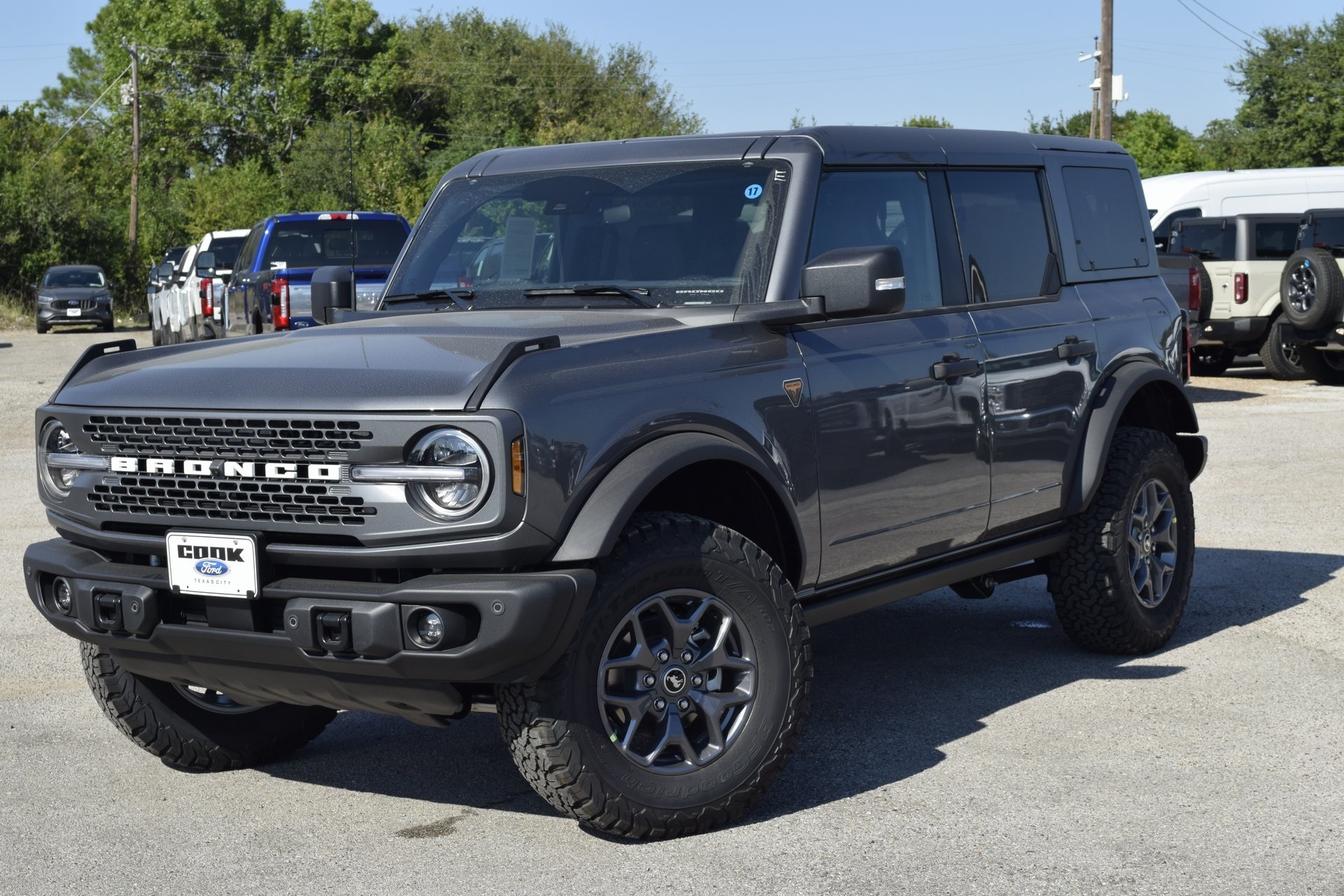 This 2025 Ford Bronco Badlands in Carbonized Gray Metallic comes with the following features: 2.7L EcoBoost® V6 10-Speed Automatic 4WD Equipment Group 334A Lux Package (Connected Navigation), 4-Wheel Disc Brakes, 4.7 Axle Ratio, 7 Speakers, ABS brakes, Air Conditioning, Alloy wheels, AM/FM radio: SiriusXM with 360L, AM/FM Stereo, Auto High-beam Headlights, Auto-dimming Rear-View mirror, Body Color-Painted Hard Top, Brake assist, Compass, Delay-off headlights, Driver door bin, Driver vanity mirror, Dual front impact airbags, Dual front side impact airbags, Electronic Stability Control, Emergency communication system: 911 Assist, Exterior Parking Camera Rear, Front anti-roll bar, Front Bucket Seats, Front Center Armrest, Front fog lights, Front reading lights, Front wheel independent suspension, Fully automatic headlights, Hard Top Sound Deadening Headliner, Heated door mirrors, Heated Front Seats, Heated steering wheel, Illuminated entry, Integrated roll-over protection, Leather Shift Knob, Low tire pressure warning, Marine Grade Vinyl Heated Bucket Seats, Occupant sensing airbag, Outside temperature display, Overhead airbag, Overhead console, Panic alarm, Passenger door bin, Passenger vanity mirror, Power door mirrors, Power steering, Power windows, Radio data system, Rear-Window Defroster & Washer, Remote keyless entry, Security system, SiriusXM w/360L, Speed control, Split folding rear seat, Steering wheel mounted audio controls, SYNC® 4, Tachometer, Telescoping steering wheel, Tilt steering wheel, Traction control, Trip computer, Variably intermittent wipers, and Voltmeter.