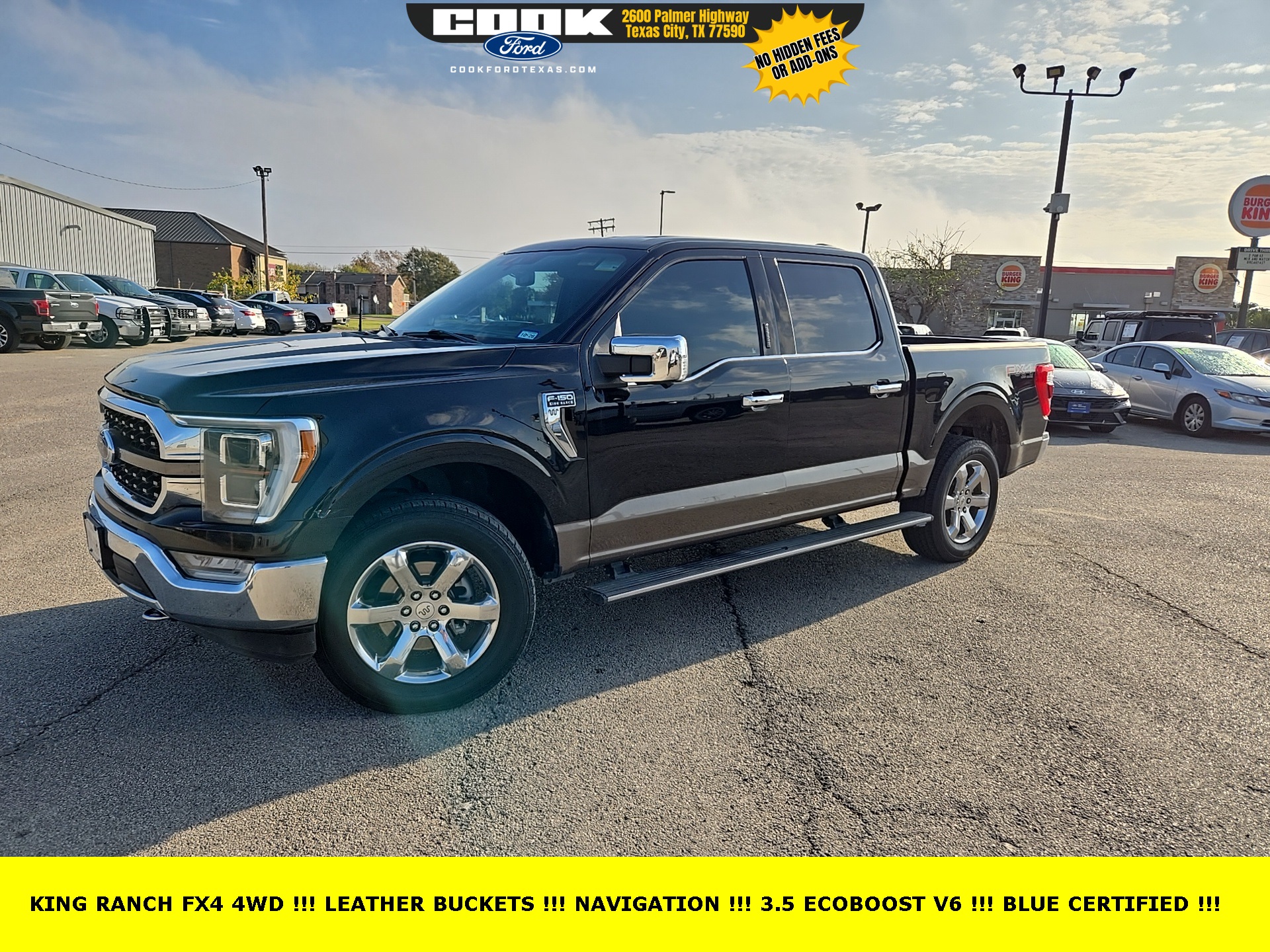 Certified. Agate Black Metallic 2021 Ford F-150 King Ranch 4WD 10-Speed Automatic 3.5L V6 EcoBoost® 20″ Machined-Aluminum Wheels, 360 Degree Camera, 4×4 FX4 Off-Road Bodyside Decal, Bright Belt Moldings, Chrome Door Handles w/Body-Color Strap, Chrome Skull Caps on Exterior Mirrors, Electronic Locking w/3.31 Axle Ratio, Equipment Group 601A High, Extended Range 36 Gallon Fuel Tank, FX4 Off-Road Package, Hill Descent Control, King Ranch Chrome Appearance Package, Monotube Rear Shocks, Multi-Contour Driver & Passenger Seats, Navigation system: Connected Navigation (90-Day Trial), Off-Road Tuned Front Shock Absorbers, Power Tailgate, Power-Deployable Running Boards, Pro Trailer Backup Assist, Radio: B&O Unleashed Sound System by Bang & Olufsen, Rock Crawl Mode, Tow Technology Package, Tray Style Floor Liner, Wheels: 20″ Chrome-Like PVD.