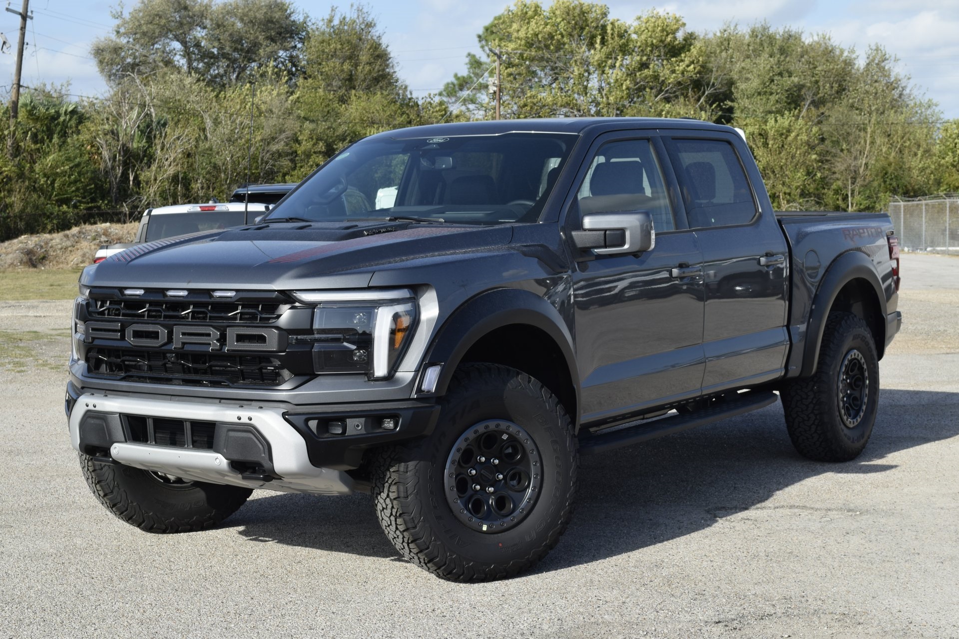 This 2025 Ford F-150 Raptor in Gray comes with the following features: 3.5L V6 EcoBoost® 10-Speed Automatic 4WD Equipment Group 802A Raptor 37 (Carbon Fiber Interior Appliques, Dual Valve Shocks, Modular Front Bumper, RECARO Alcantara Suede Front Seats, and Wheels: Raptor 37 Unique 17″ Cast Aluminum), 14 Speakers, 17″ Cast Aluminum Wheels, 4-Wheel Disc Brakes, ABS brakes, Adjustable pedals, Air Conditioning, Alloy wheels, AM/FM radio: SiriusXM with 360L, Auto High-beam Headlights, Auto tilt-away steering wheel, Auto-dimming door mirrors, Auto-dimming Rear-View mirror, Automatic temperature control, Brake assist, Bumpers: body-color, Compass, Delay-off headlights, Driver door bin, Driver vanity mirror, Dual front impact airbags, Dual front side impact airbags, Electronic Locking w/4.10 Axle Ratio, Electronic Stability Control, Emergency communication system: SYNC® 4 911 Assist, Front anti-roll bar, Front Bucket Seats, Front Center Armrest, Front dual zone A/C, Front fog lights, Front reading lights, Front wheel independent suspension, Fully automatic headlights, Garage door transmitter, Heads-Up Display, Heated door mirrors, Heated Front Seats, Heated rear seats, Heated steering wheel, Illuminated entry, Lane Departure Warning System, Leather steering wheel, Leather Trimmed Seats, Low tire pressure warning, Memory seat, Navigation system: Connected Navigation, Occupant sensing airbag, Outside temperature display, Overhead airbag, Overhead console, Panic alarm, Passenger door bin, Passenger vanity mirror, Pedal memory, Power door mirrors, Power driver seat, Power passenger seat, Power steering, Power windows, Radio data system, Radio: B&O Unleashed Sound System by Bang & Olufsen, Rain sensing wipers, Rear reading lights, Rear step bumper, Rear window defroster, Remote keyless entry, Security system, Speed control, Speed-sensing steering, Split folding rear seat, Steering wheel memory, Steering wheel mounted audio controls, SYNC® 4 w/Enhanced Voice Recognition, Tachometer, Telescoping steering wheel, Tilt steering wheel, Tough Bed Spray-In Bedliner, Traction control, Trip computer, Turn signal indicator mirrors, Twin Panel Moonroof, Variably intermittent wipers, and Ventilated front seats.