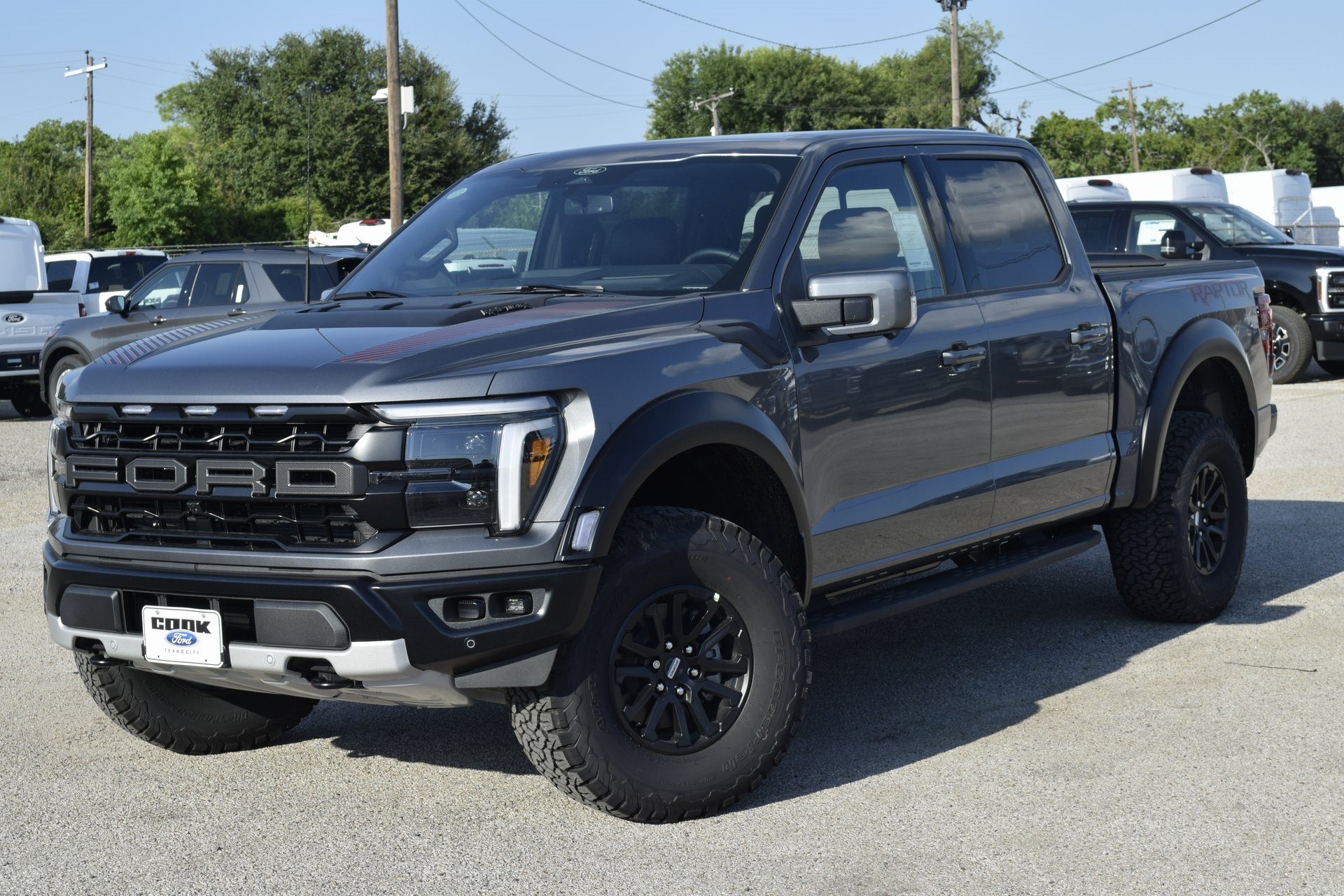 This 2025 Ford F-150 Raptor in Carbonized Gray Metallic comes with the following features: 3.5L V6 EcoBoost® 10-Speed Automatic 4WD 14 Speakers, 17″ Cast Aluminum Wheels, 4-Wheel Disc Brakes, ABS brakes, Adjustable pedals, Air Conditioning, Alloy wheels, AM/FM radio: SiriusXM with 360L, Auto High-beam Headlights, Auto tilt-away steering wheel, Auto-dimming door mirrors, Auto-dimming Rear-View mirror, Automatic temperature control, Brake assist, Bumpers: body-color, Compass, Delay-off headlights, Driver door bin, Driver vanity mirror, Dual front impact airbags, Dual front side impact airbags, Electronic Locking w/4.10 Axle Ratio, Electronic Stability Control, Emergency communication system: SYNC® 4 911 Assist, Front anti-roll bar, Front Bucket Seats, Front Center Armrest, Front dual zone A/C, Front fog lights, Front reading lights, Front wheel independent suspension, Fully automatic headlights, Garage door transmitter, Heads-Up Display, Heated door mirrors, Heated Front Seats, Heated rear seats, Heated steering wheel, Illuminated entry, Lane Departure Warning System, Leather steering wheel, Low tire pressure warning, Memory seat, Navigation system: Connected Navigation, Occupant sensing airbag, Outside temperature display, Overhead airbag, Overhead console, Panic alarm, Passenger door bin, Passenger vanity mirror, Pedal memory, Power door mirrors, Power driver seat, Power passenger seat, Power steering, Power windows, Radio data system, Radio: B&O Unleashed Sound System by Bang & Olufsen, Rain sensing wipers, Rear reading lights, Rear step bumper, Rear window defroster, Remote keyless entry, Security system, Speed control, Speed-sensing steering, Split folding rear seat, Steering wheel memory, Steering wheel mounted audio controls, SYNC® 4 w/Enhanced Voice Recognition, Tachometer, Telescoping steering wheel, Tilt steering wheel, Traction control, Trip computer, Turn signal indicator mirrors, Twin Panel Moonroof, Variably intermittent wipers, and Ventilated front seats.