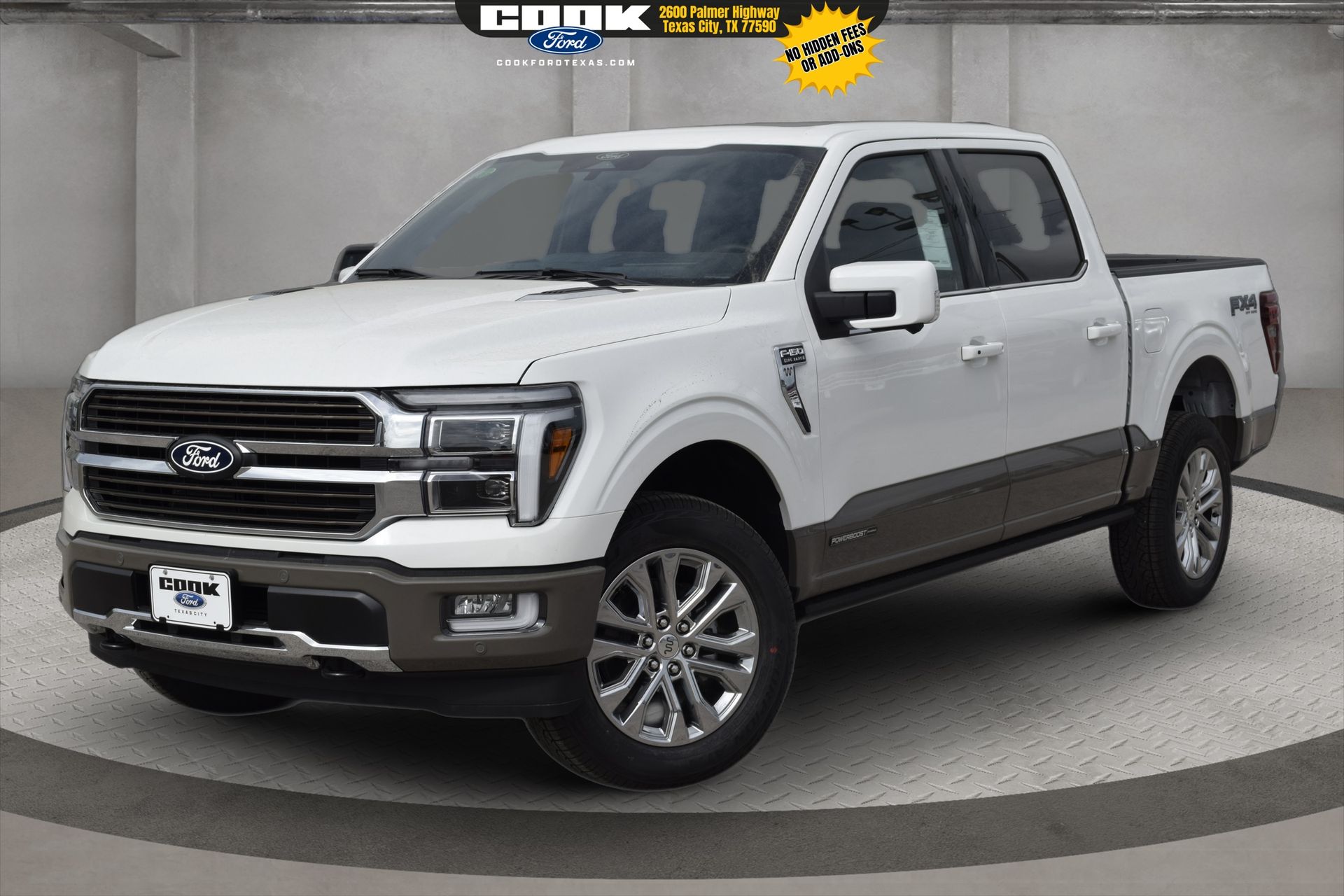 This 2026 Ford F-150 King Ranch in Star White Metallic Tri-Coat comes with the following features: 3.5L PowerBoost Full-Hybrid V6 10-Speed Automatic 4WD Ford Connectivity Package (1-Year Included), GVWR: 7,400 lbs Payload Package, Internet access capable: 5G Modem – Ford Connectivity Package, 4-Wheel Disc Brakes, 8 Speakers, ABS brakes, Adjustable pedals, Air Conditioning, Alloy wheels, AM/FM radio: SiriusXM with 360L, Auto High-beam Headlights, Auto tilt-away steering wheel, Auto-dimming door mirrors, Auto-dimming Rear-View mirror, Automatic temperature control, Brake assist, Chrome wheels, Compass, Delay-off headlights, Driver door bin, Driver vanity mirror, Dual front impact airbags, Dual front side impact airbags, Electronic Locking with 3.55 Axle Ratio, Electronic Stability Control, Emergency communication system: SYNC® 4 911 Assist, Front anti-roll bar, Front Bucket Seats, Front Center Armrest, Front dual zone A/C, Front fog lights, Front reading lights, Front wheel independent suspension, Fully automatic headlights, Garage door transmitter, Genuine wood dashboard insert, Heated door mirrors, Heated Front Seats, Heated rear seats, Heated steering wheel, Illuminated entry, Leather steering wheel, Low tire pressure warning, Memory seat, Navigation system: Connected Navigation, Occupant sensing airbag, Outside temperature display, Overhead airbag, Overhead console, Panic alarm, Passenger door bin, Passenger vanity mirror, Pedal memory, Power door mirrors, Power driver seat, Power passenger seat, Power steering, Power windows, Radio data system, Radio: B&O Sound System by Bang and Olufsen, Rain sensing wipers, Rear reading lights, Rear seat center armrest, Rear step bumper, Rear window defroster, Remote keyless entry, Security system, Speed control, Split folding rear seat, Steering wheel memory, Steering wheel mounted audio controls, SYNC® 4 with Enhanced Voice Recognition, Tachometer, Telescoping steering wheel, Tilt steering wheel, Traction control, Trip computer, Turn signal indicator mirrors, Variably intermittent wipers, Ventilated front seats, and Wheels: 20″ Chrome-Like PVD. Rebates subject to geographical qualification. Price includes: *Manufacturer’s Rebates shown above are subject to residency restrictions. Any customer not meeting the residency restriction will receive a dealer discount in the same amount of the manufacturer rebate.$500 – Retail Customer Cash. Exp. 04/30/2026