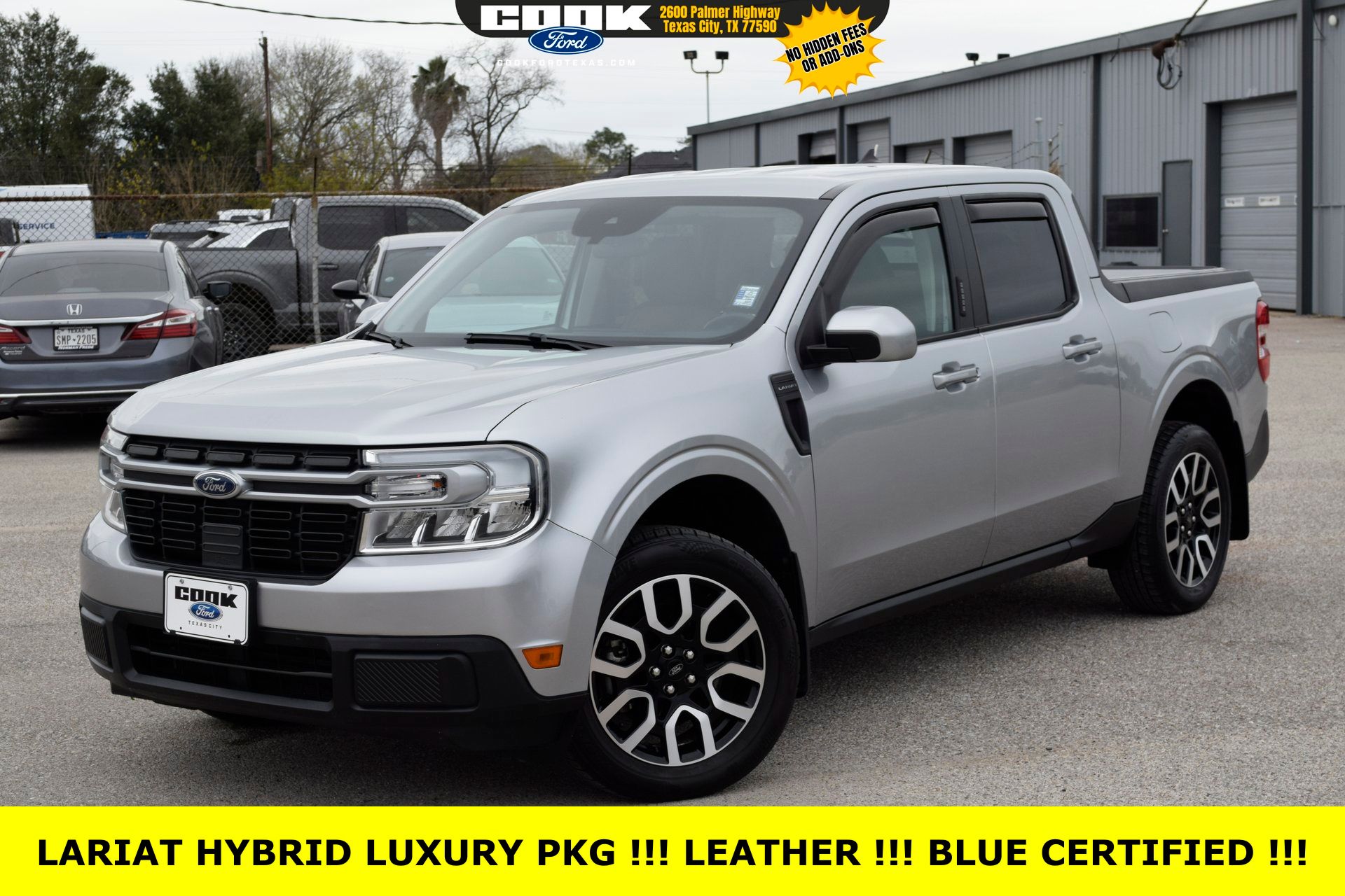 Certified. Iconic Silver Metallic 2022 Ford Maverick LARIAT FWD CVT 2.5L I-4 Hybrid 4-Way Front Headrest, 400W Inverter w/USB Console Rear, ABS brakes, Adaptive Cruise Control w/Stop & Go, Alloy wheels, Bed Tie Down Locking Rails, BLIS Blind Spot Info System w/Cross-Traffic Alert, Compass, Electronic Stability Control, Evasive Steering Assist, Ford Co-Pilot360, Front dual zone A/C, Heated Mirror, Heated Seats, Heated Steering Wheel, Illuminated entry, Lane Centering, Lane-Keeping System, LARIAT Luxury Package, LED Box Lighting, Low tire pressure warning, Manual-Folding Power Glass Sideview Mirrors, Radio: B&O Sound System by Bang & Olufsen, Rear Parking Sensors, Remote keyless entry, Remote Start System, Spray-In Bedliner, Tonneau Pickup Box Cover – Hard Rollup, Traction control, Trailer Hitch Receiver w/4-Pin Connector, Windshield Wiper De-Icer, Wireless Charging Pad.